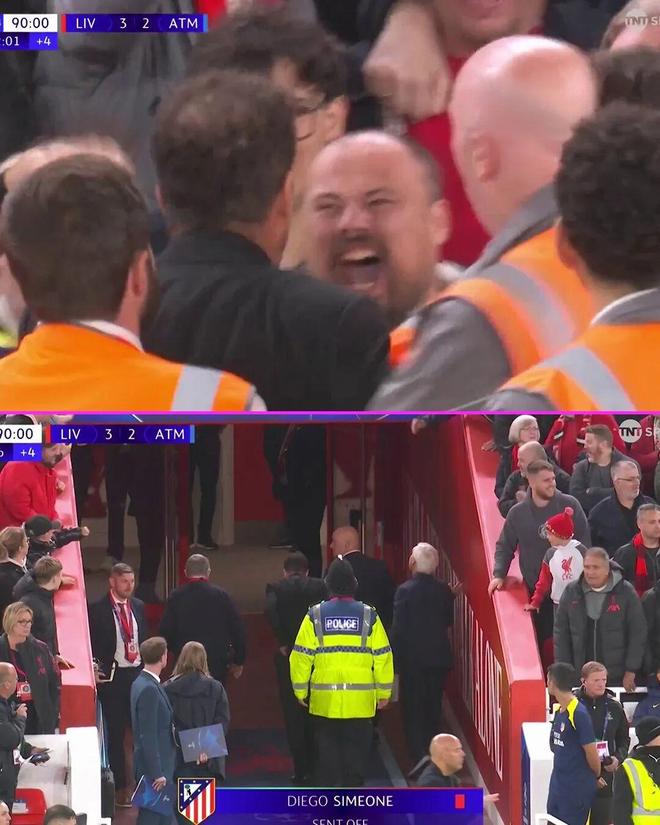在利物浦凭借范戴克最后时刻的进球3-2绝杀马德里竞技。而在这粒进球出现之后,场内一片混乱,而马竞主帅迭戈·西蒙尼因暴怒被红牌罚下。据悉,西蒙尼因与身后的利物浦球迷发生口角,双方险些爆发冲突。而在处理冲突的过程中,西蒙尼 “竖中指”,最终他被红牌罚下提前离场。