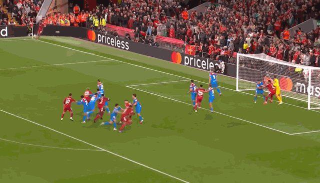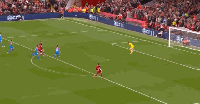 开场第4分钟,萨拉赫主罚禁区前沿的直接任意球,打在安迪·罗伯逊的身上弹进球门。利物浦在主场闪电取得领先。