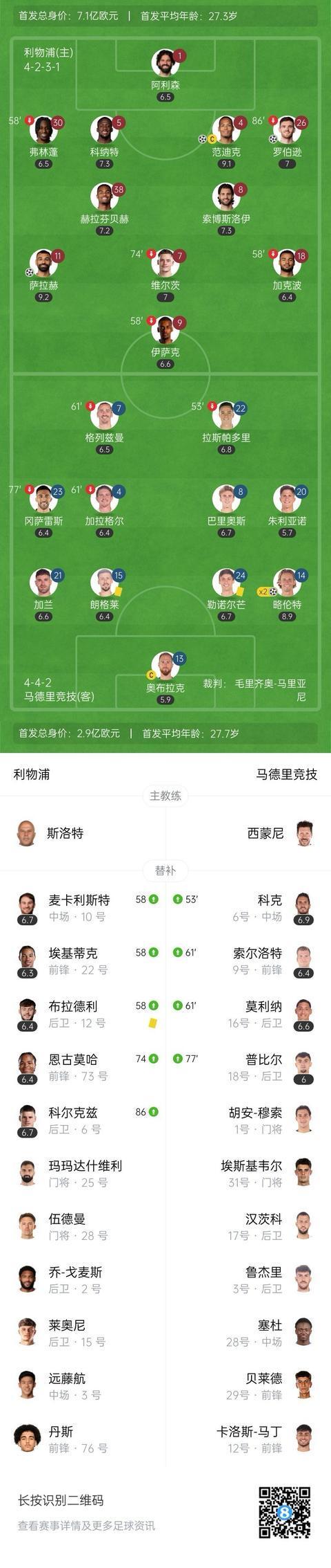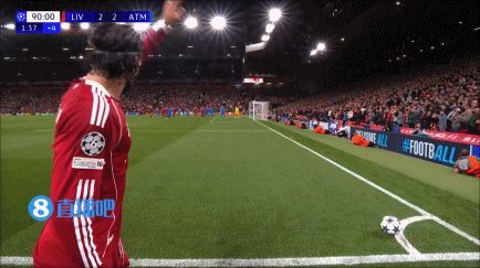 全场比赛结束,利物浦主场3-2绝杀马德里竞技。