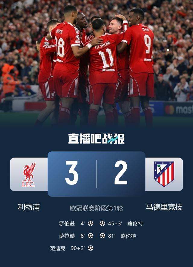 9月18日西甲日报讯 北京时间9月18日凌晨3时整,2025-26赛季欧冠联赛阶段第1轮在安菲尔德球场展开角逐,利物浦主场迎战马德里竞技。上半场红军开局2分钟2球,萨拉赫传射+1V3破门,罗伯逊折射建功,略伦特扳回一城,下半场萨拉赫中柱,略伦特凌空斩扳平+本场双响,范迪克补时绝杀。最终利物浦3-2战胜马竞,红军取得各赛事5连胜+连续5场绝杀。利物浦下轮将客战加拉塔萨雷,马竞将对阵法兰克福。