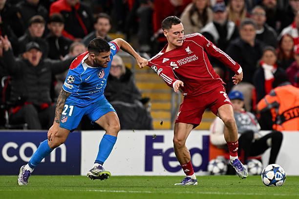 第81分钟,科克突破下底制造混乱,巴里奥斯传中被范戴克挡出,略伦特禁区前沿凌空抽射,击中麦卡利斯特之后折射入网,后者完成梅开二度好戏,马竞连扳2球,2-2!