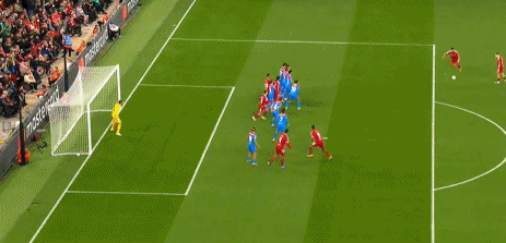 萨拉赫处理禁区外的直接任意球,一脚贴地箭击中罗伯逊,打了奥布拉克一个措手不及,1-0!