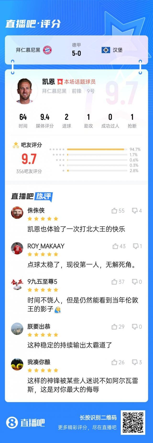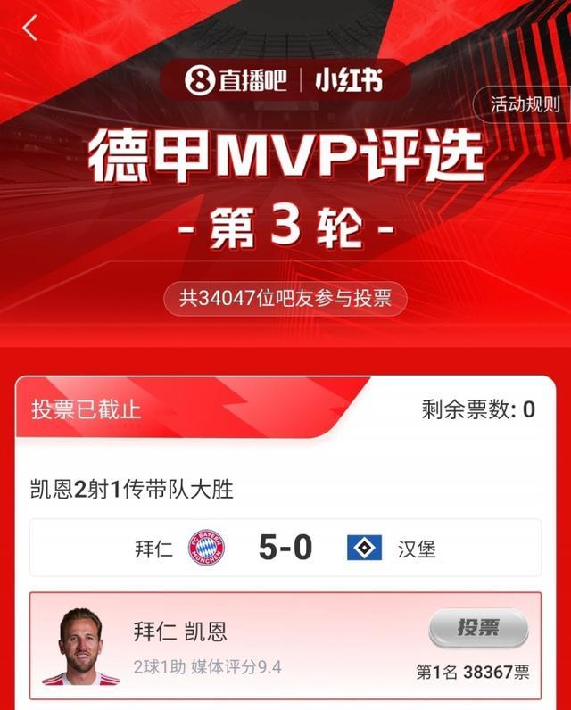 第三轮评选结果结出炉,凯恩2射1传,帮助拜仁5-0大胜汉堡,获得吧友近4万票的支持,击败格里马尔多当选 【X小红书德甲第3轮最佳球员】!